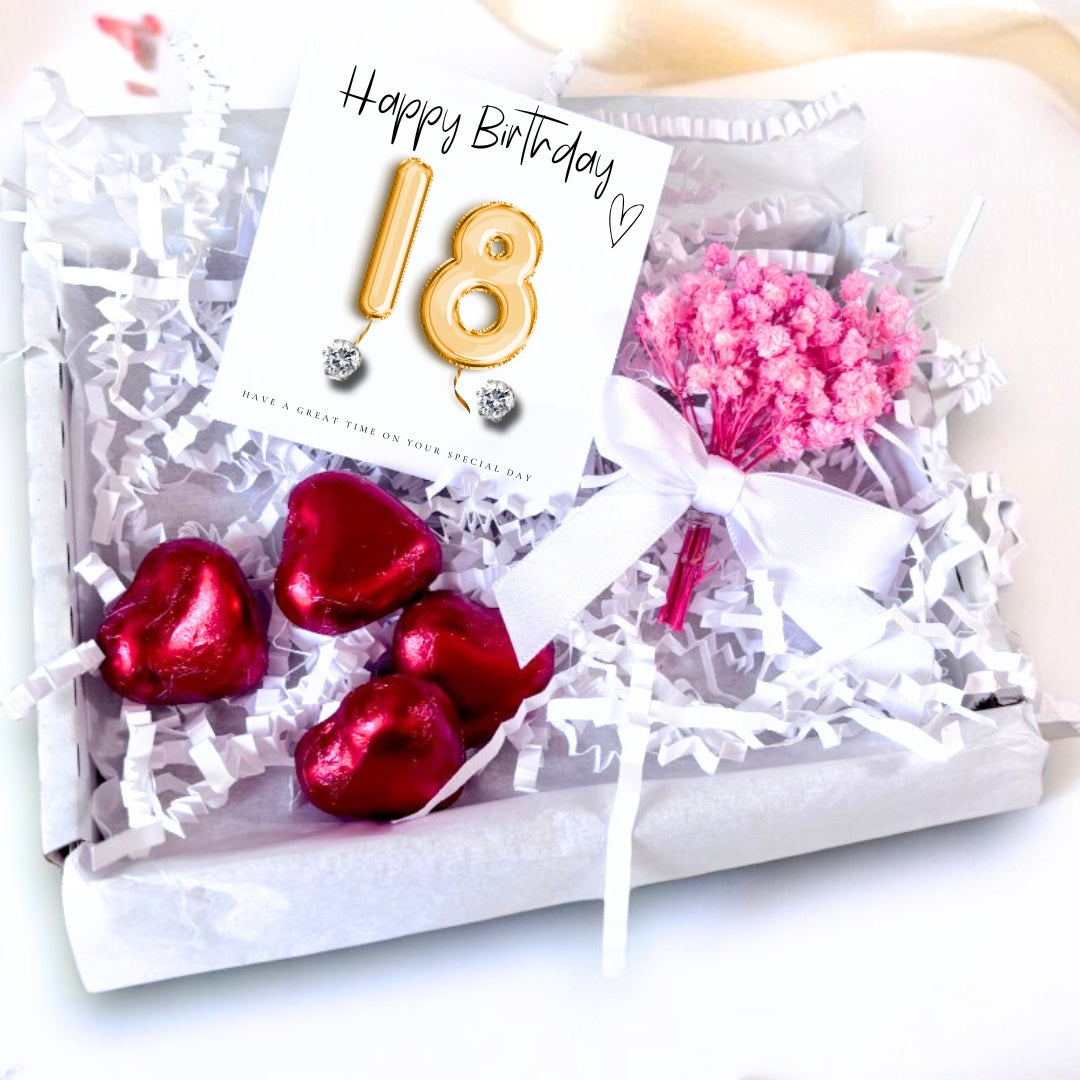 Make the 18th birthday of a special someone truly unique with our exquisite earrings on a gold balloons message card and comes with six delicious milk chocolate hearts. These stunning cubic zirconia stud earrings are a perfect gift for the birthday girl, plus, they're hypoallergenic for sensitive ears. Choose to express your feelings with a special message or let their beauty speak for itself, either way, it's a gift that will be cherished for years to come.