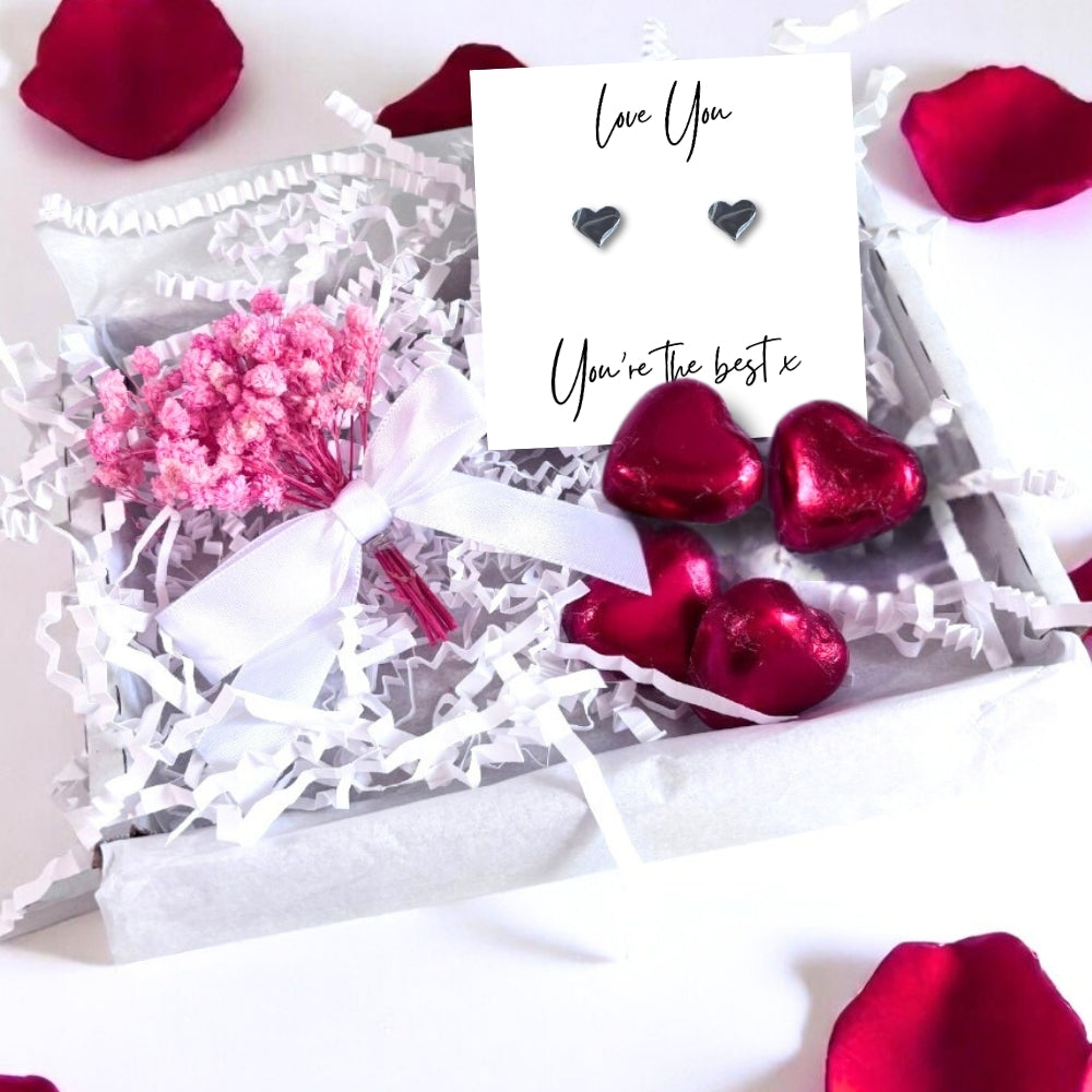 Our lovely mini gift hamper is the perfect gift for a Birthday, Valentine's or Anniversary with our cute silver coloured hypoallergenic heart earrings come with a lovely little message card with the words "Love you, you're the best x", and comes with delicious milk chocolate hearts . Choose to express your feelings with a special message or let their beauty speak for itself, either way, it's a gift that will be cherished for years to come.
